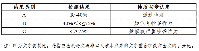 3.论文文字重合比在40%~75%之间(含75%)的学生(B类),由院系通知学生本人根据检测结果进行相应修改调整,修改时间至少1周,修改后须进行复检。复检后的文字重合比降至40%以下者,视为通过。