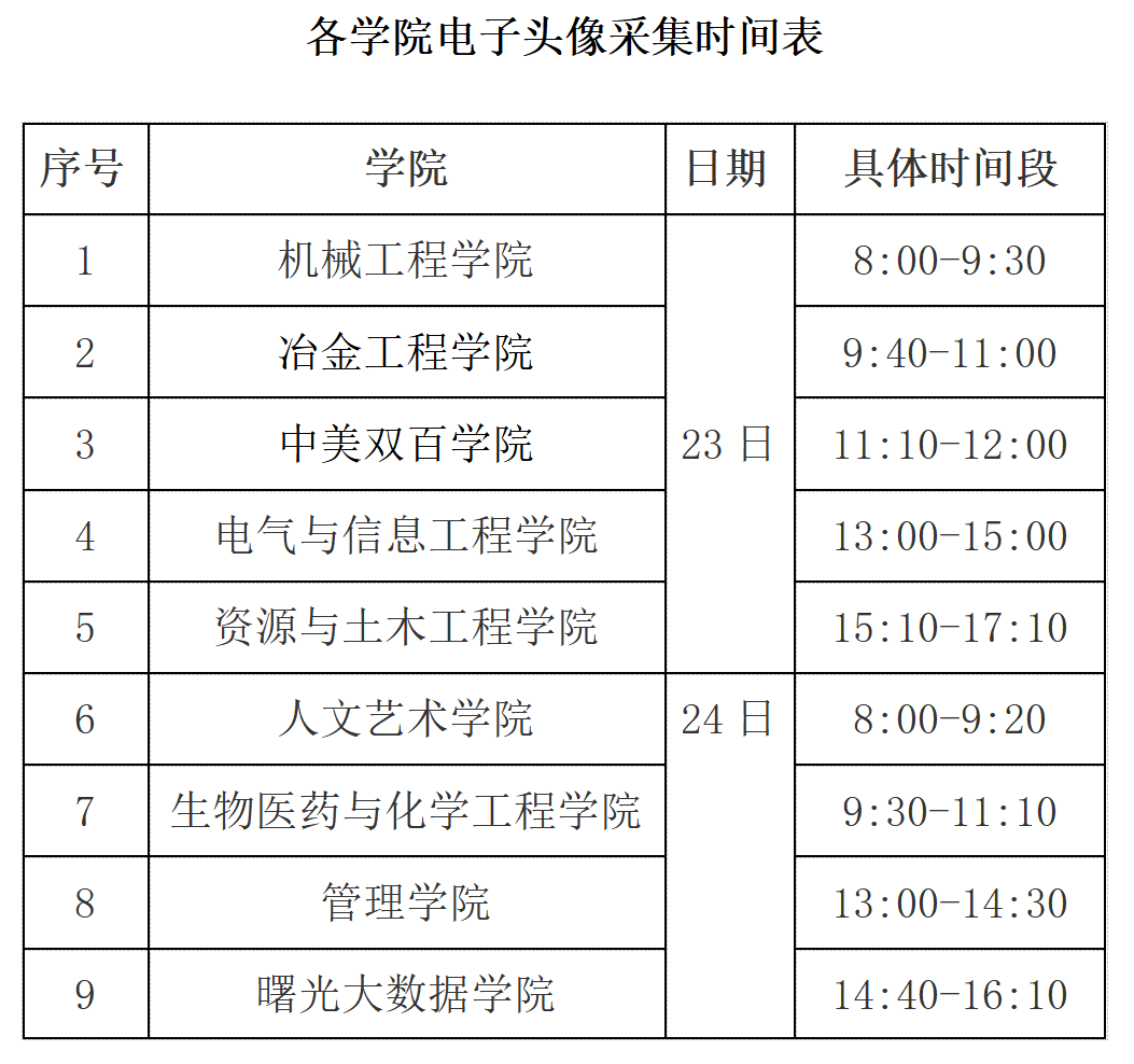 二、集中采集时间安排:2021年10月23日(周六)、10月24日(周日)。各院系具体安排时间见下表,如有变动请联系高老师。