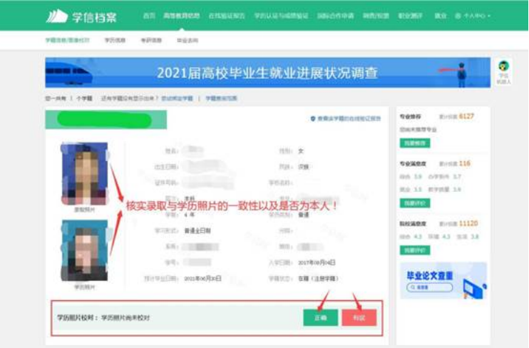 3、核对学历照片,若学历照片为本人请点击“正确”(切勿点击“有误”),若学历照片非本人请点击“有误”。